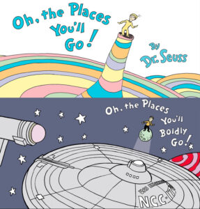ComicMix, together with creators David Gerrold and Ty Templeton, created a Kickstarter campaign to fund the printing and distribution of a work, Oh, the Places You’ll Boldly Go!. The work was a clear nod to Theodor Geisel‘s [better know as Dr. Seuss] Oh, the Places You’ll Go!, a mash-up of the Seuss book with various aspects of Star Trek.
